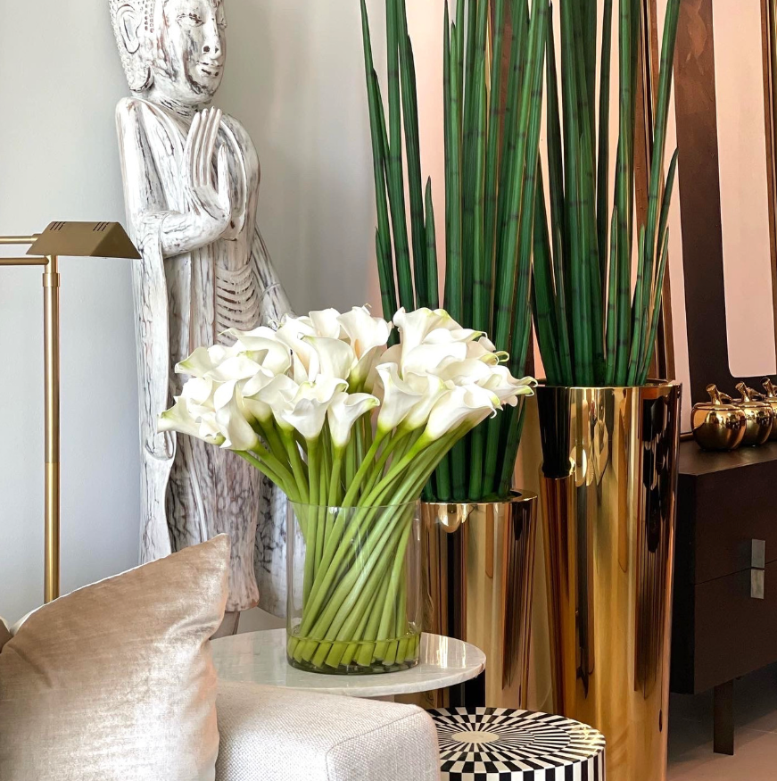 The elegance of fresh-cut flowers with the year-round beauty of faux blooms. This arrangement features exquisite calla lilies displayed in a crystal-clear glass cylinder vase, perfect for adding a refined touch to any room. Whether complementing a winter-white décor or bringing a coastal feel to your summer home, this piece offers timeless versatility.