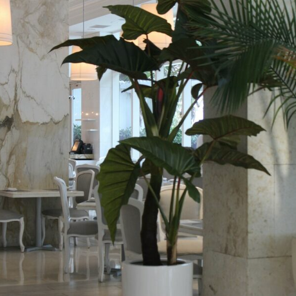 A bold and elegant statement piece, this large Red Prince Alocasia is set in a glossy white Dice XL fibreglass planter, topped with white stones for a refined finish. Known as “elephant’s ear,” the Alocasia features large, beautifully patterned leaves that add a lush and tropical touch to any interior.