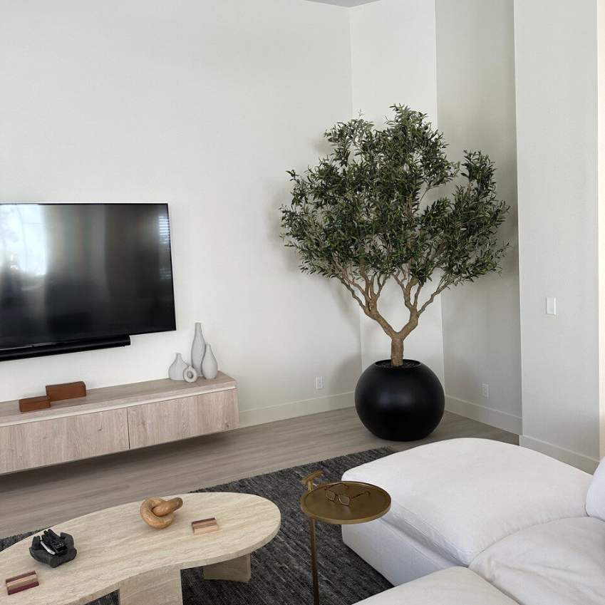 A beautifully crafted faux olive tree that captures the timeless charm of the Mediterranean, bringing natural elegance to any interior or covered outdoor space. Set in our bestselling matte black globe planter measuring 76 cm in width and 61 cm in height, each tree is designed with remarkable attention to detail, achieving an incredibly lifelike appearance. Perfect for enhancing a living room, dining area, office or sheltered patio, this low-maintenance piece offers year-round beauty without the need for care.